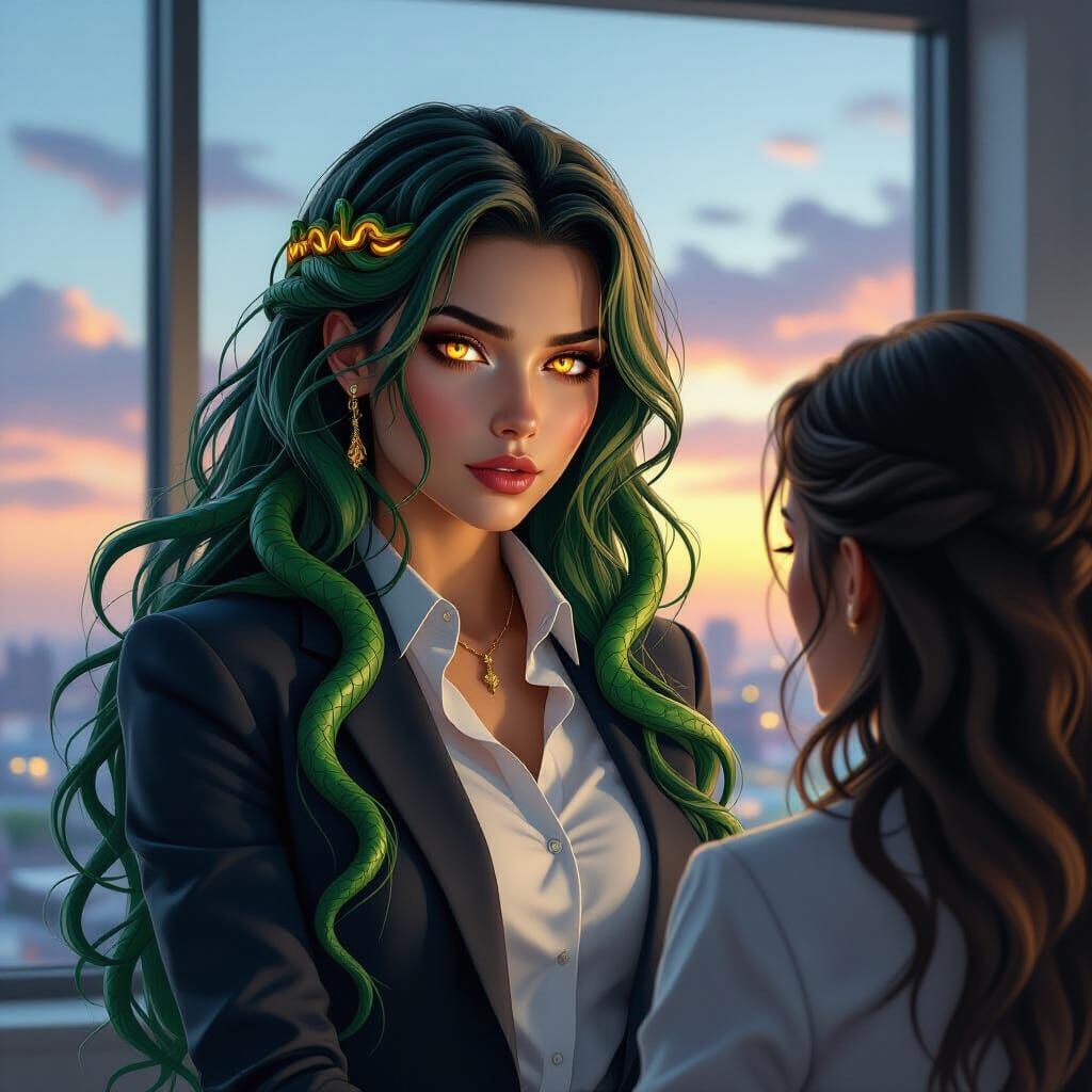 A hyper-realistic poster shows a young Medusa in office attire, her green snake-like hair flowing. She apologizes to a stone colleague, with dramatic lighting and a peaceful sky visible.