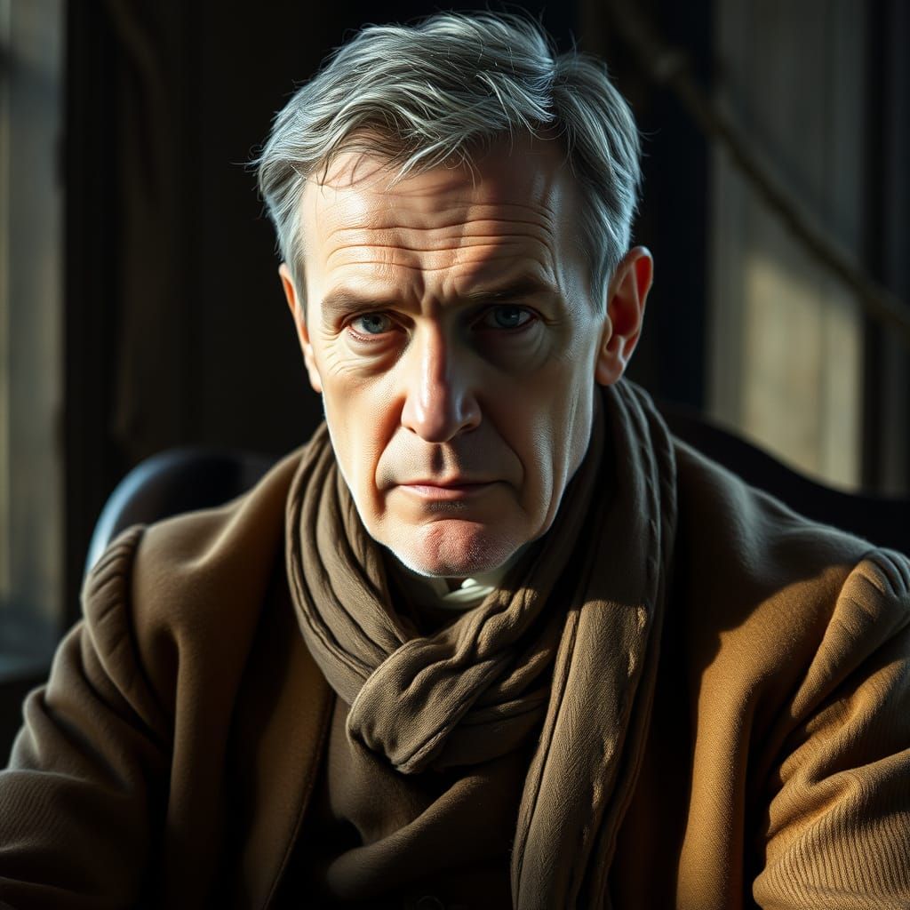 A cinematic image of an archmage in Edwardian attire, sitting in partial shadow. The portrait features subtle film grain and dramatic color grading, reminiscent of a film still.