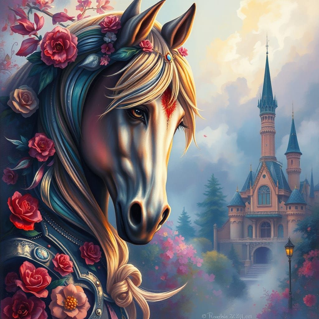 A vibrant fairground scene with a majestic carousel, rendered in hyper-realistic charcoal with ethereal fantasy elements and a misty atmosphere. The image evokes neo-impressionism with thick brush strokes and layered, colorful paint.