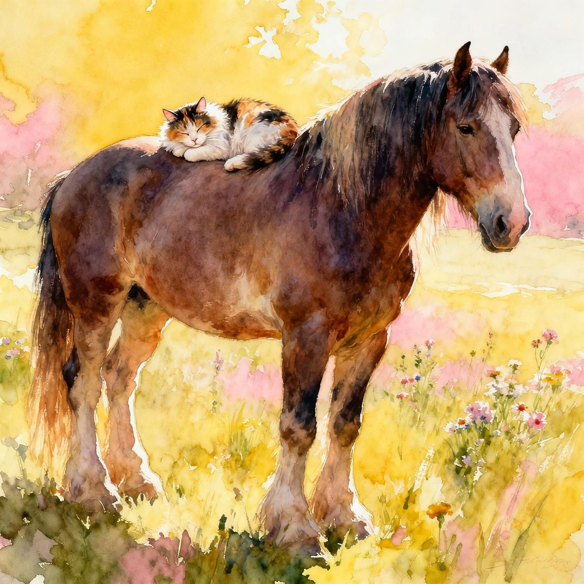 This image shows a fluffy calico cat sleeping on a shire horse in a sun-dappled meadow. Rendered in a loose, expressive watercolor style with warm hues and gentle blending.