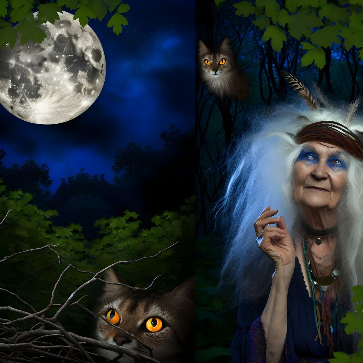 In a composition imbued with a sense of mystery and wild beauty, an older, eccentric woman of Bohemian descent, possessing a mane of untamed, white hair, stands amidst a sylvan setting. It is the witching hour, and the sole source of illumination is a majestic, full moon perched in the indigo sky, casting ...