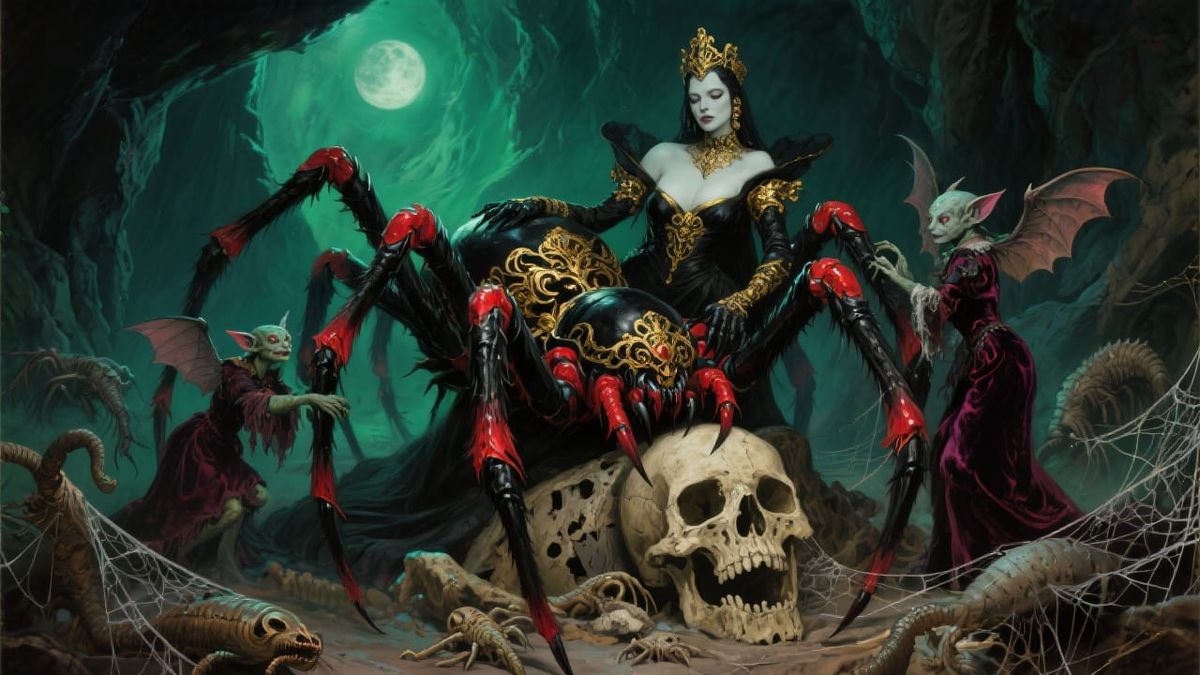 A dramatic image shows a massive black and red spider with gold baroque accents perched on a gothic skull. Winged imp-like creatures attend to her in an eerie, emerald-lit cave, rendered with deep chiaroscuro.