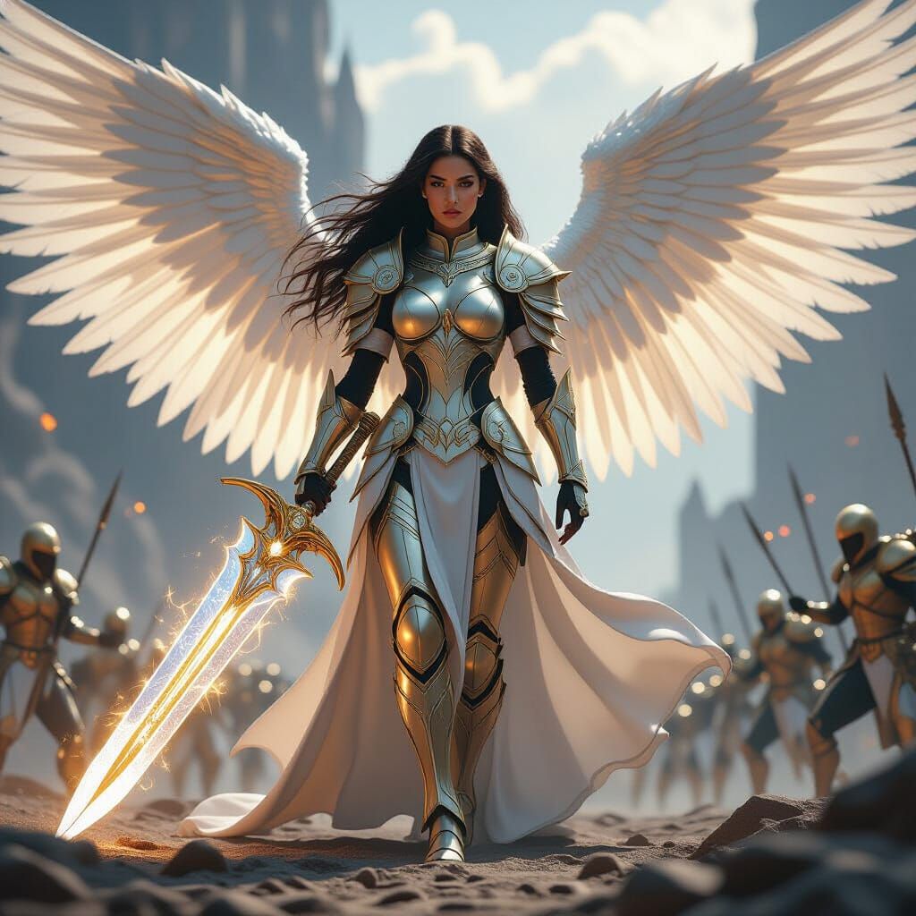 A striking picture of an armored female angel on a battlefield. She wields a glowing sword and has large white wings. The artwork features polished metal and futuristic elements in a sci-fi aesthetic.
