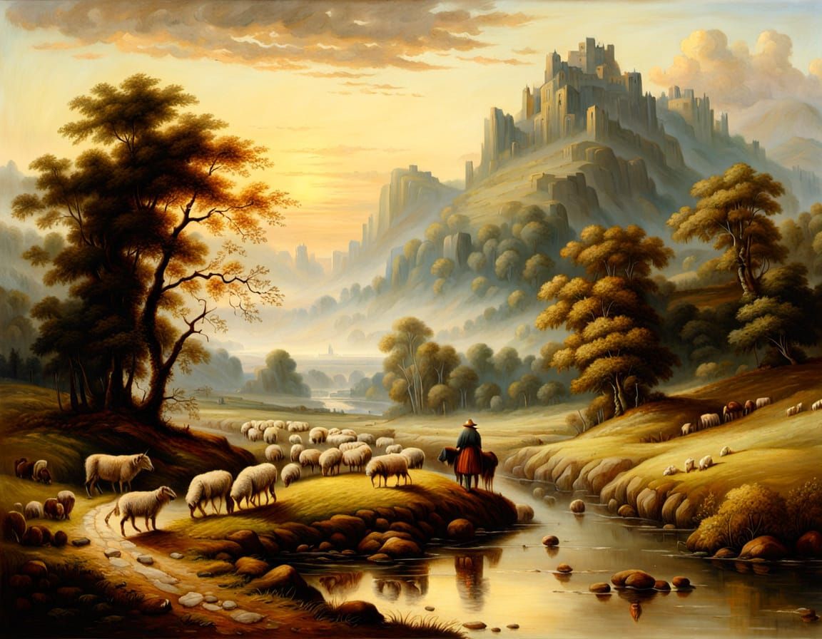 This image shows a Renaissance landscape depicting a shepherd guiding a small herd of sheep across a ford. The scene is bathed in warm, golden light, rendered with soft brushstrokes and earthy tones.