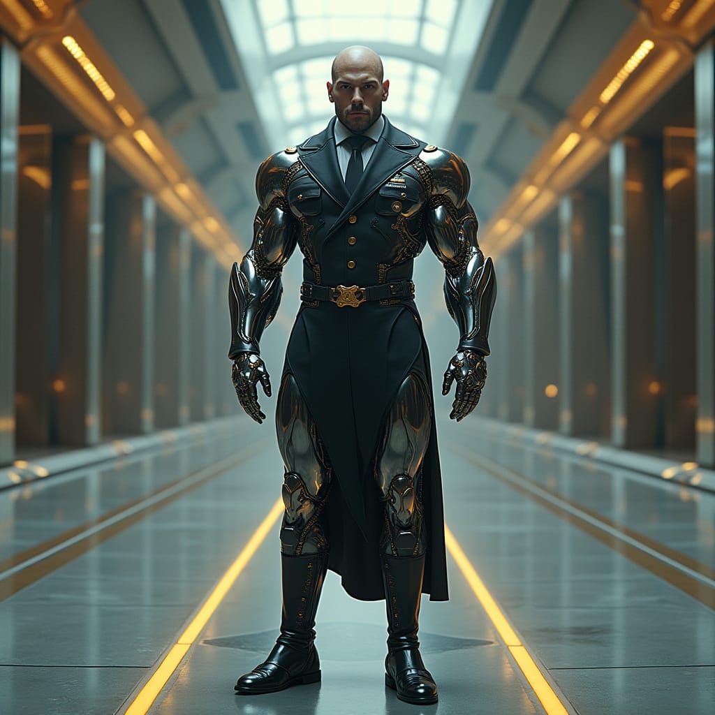 A powerful cyborg general stands in a futuristic hall. The figure has chrome limbs and wears a detailed military uniform with gold accents. The image is in a dark cyberpunk aesthetic.