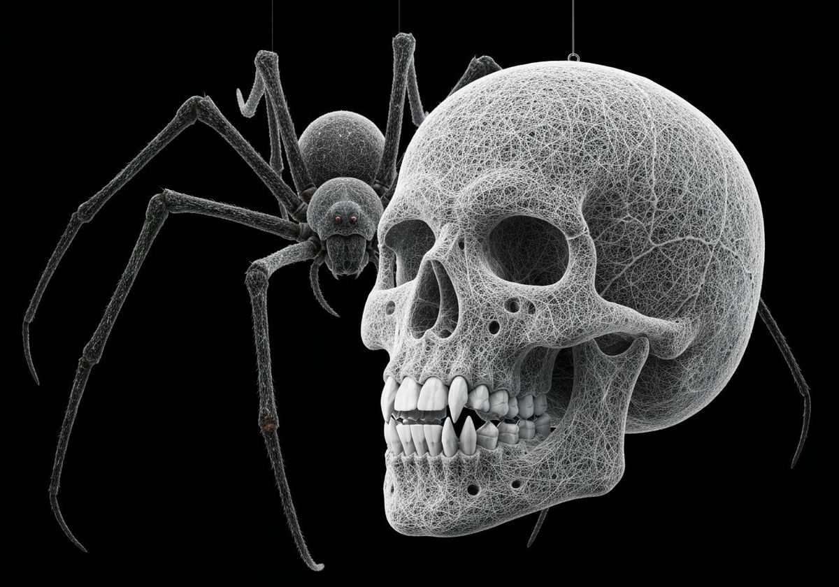A 16k ultra-high resolution, photo-realistic image showcases a skull crafted from delicate, luminous spiderwebs against a dramatic black backdrop with intense lighting. A colossal spider's shadow looms.