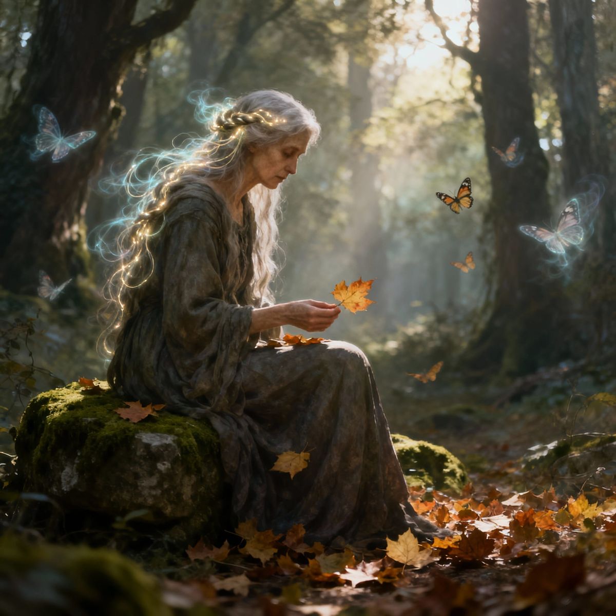 This vintage-style image depicts an ancient woman in an ethereal forest, surrounded by fallen leaves and spectral butterflies. Features atmospheric lighting and a soft focus, evoking magical realism.