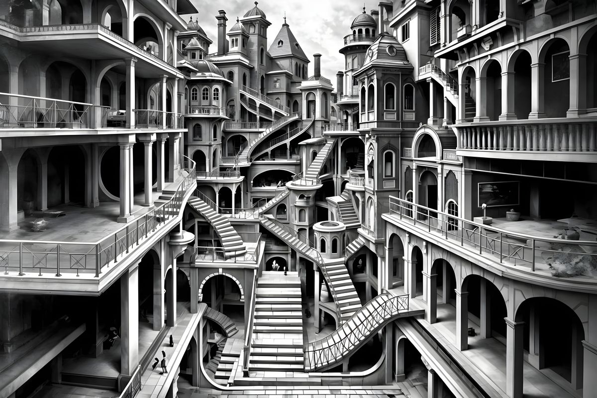 A mind-bending image of impossible architecture featuring recursive staircases and labyrinthine corridors. Evokes a dreamlike atmosphere reminiscent of M.C. Escher's distinctive perspective.