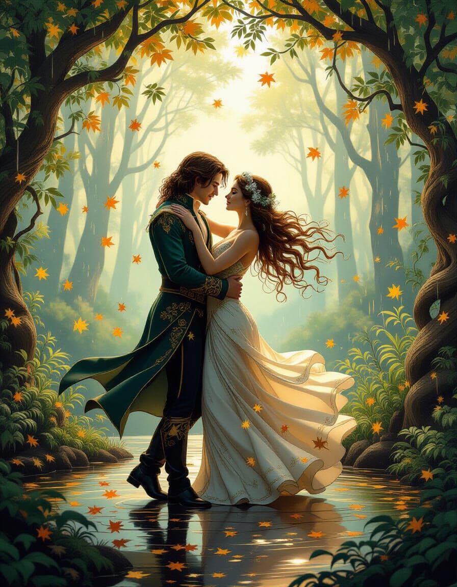 This image depicts a mythic dancing couple made of living foliage on a rain-slicked woodland stage, surrounded by swirling golden leaves in a lush, organic surreal style.