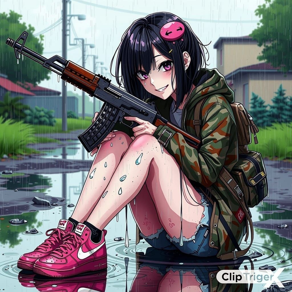 This image depicts a sad anime girl in the emo aesthetic sitting in the rain with an assault rifle. She is drawn in a detailed cel-shaded style reminiscent of anime art.