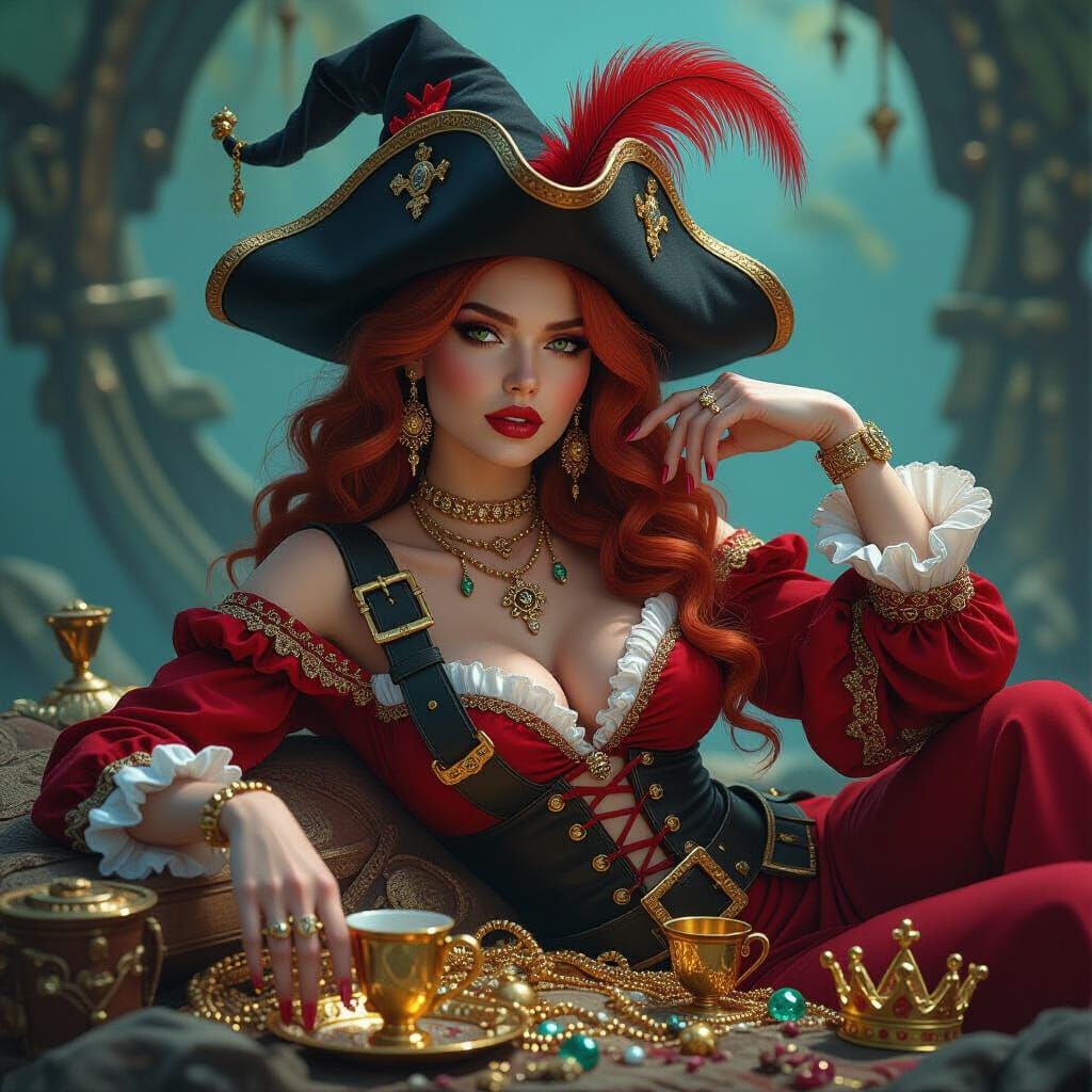 A vibrant 3D image of a red-haired pirate resting on treasure. She wears a witch's hat adorned with pirate details, surrounded by gold and jewels, rendered with intricate textures in a surreal, dreamlike style.