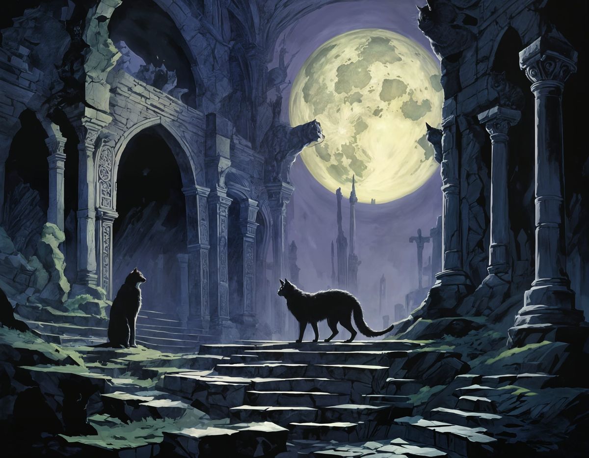 This image shows mystical cats gathered in a crumbling ancient stone ruin under a full moon. The cats possess glowing magical eyes, and subtle arcane symbols shimmer on their fur. The atmosphere is mysterious and magical, with volumetric moonlight casting eerie shadows.