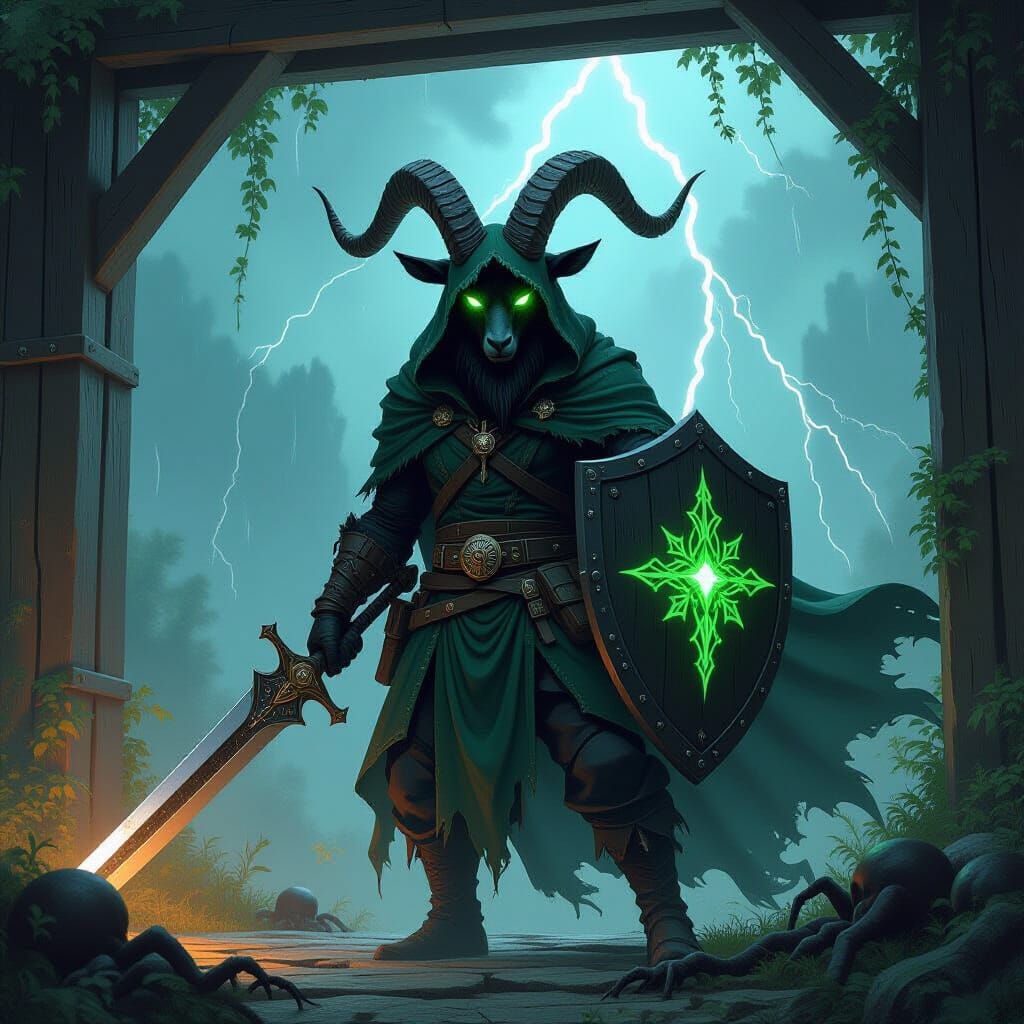 A striking picture of a dark fantasy goat man beneath a drawbridge. The creature has black fur, glowing eyes, and wields a sword and shield with runes, all set against a backdrop of a lightning storm in a detailed digital painting style.
