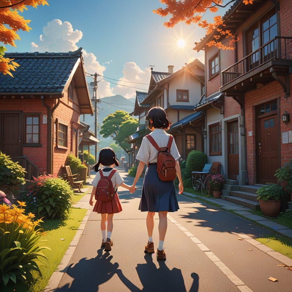 This heartwarming image depicts a young girl, six years old, eagerly walking to school with her mother's loving hand in hers. Shot in a medium format, the scene is set in a charming neighborhood with warm morning light and vibrant colors, capturing the innocence and excitement of the first day of first g...