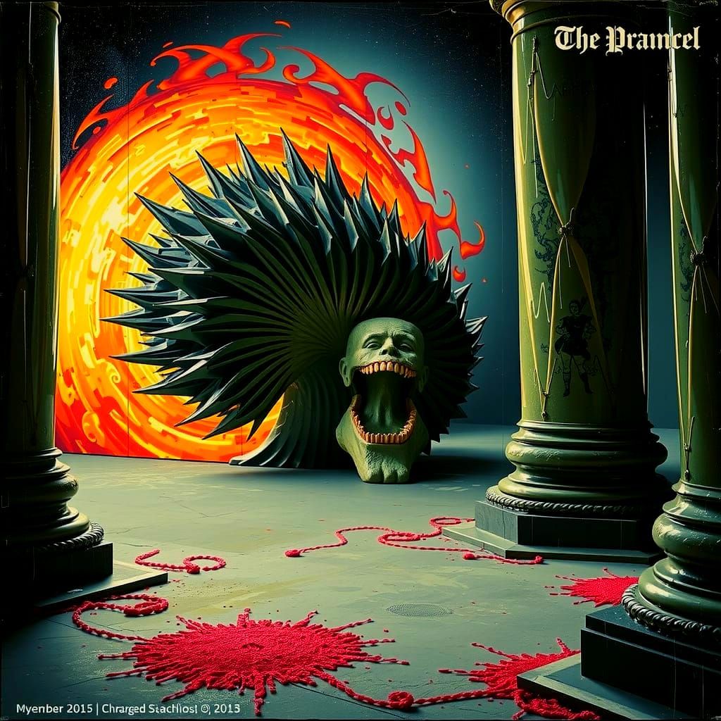 This image showcases a hyperrealistic sculpture bathed in intense, dynamic light. The artwork features intricate textures and a striking color palette of red, green, yellow, black, and white.