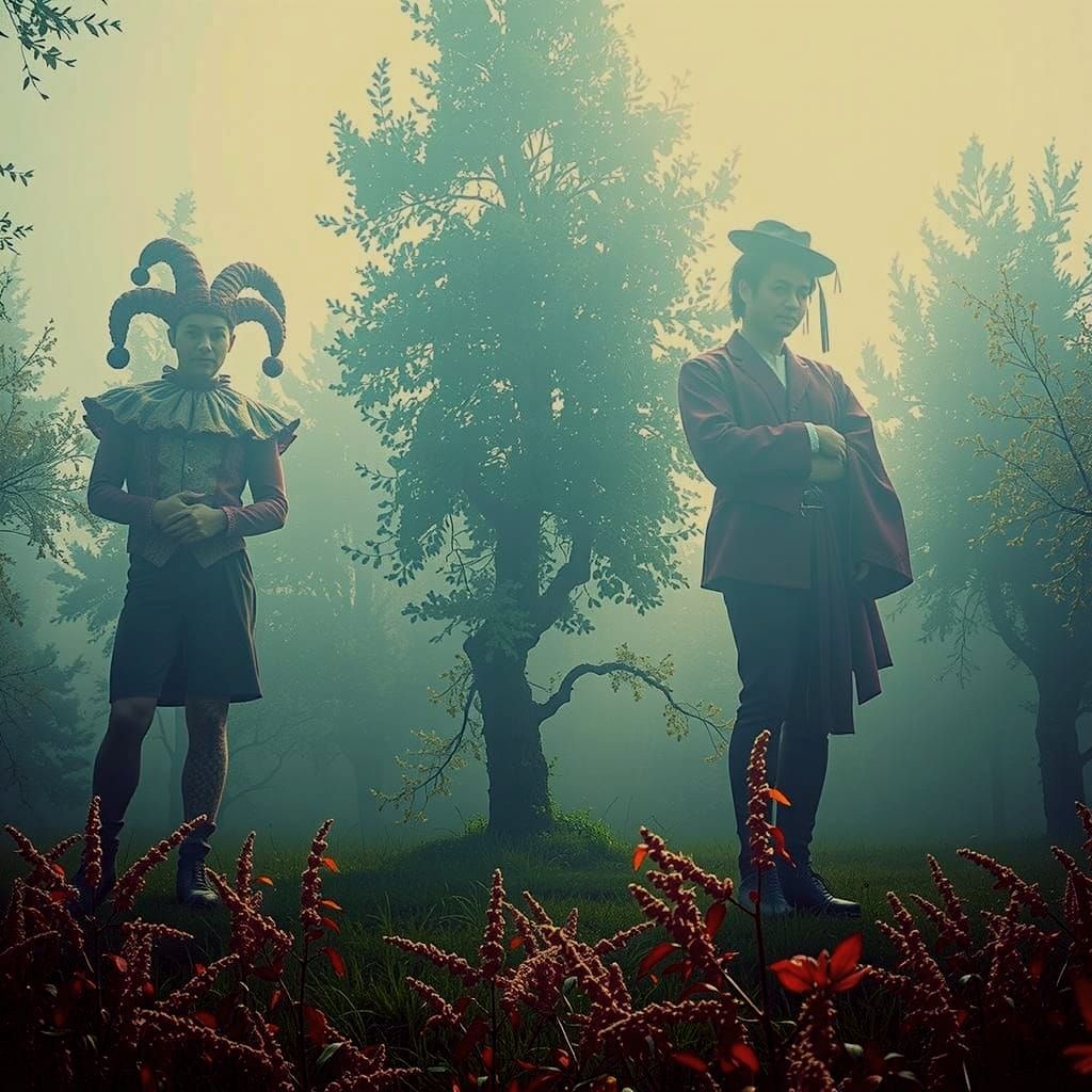 This image shows a matador, harlequin, and geisha in vibrant costumes contemplating life's cycle. Rendered in a hyper-realistic style with bold colors and a Seraphinianus aesthetic.