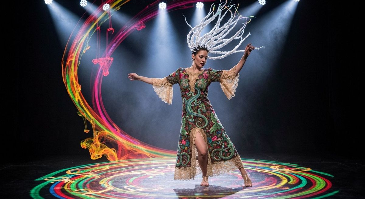 This image shows a woman in an ornate dress dancing on stage. The scene evokes psychedelic art with high contrast, energetic movement, and surreal symbolism in a vortex of vibrant colors.