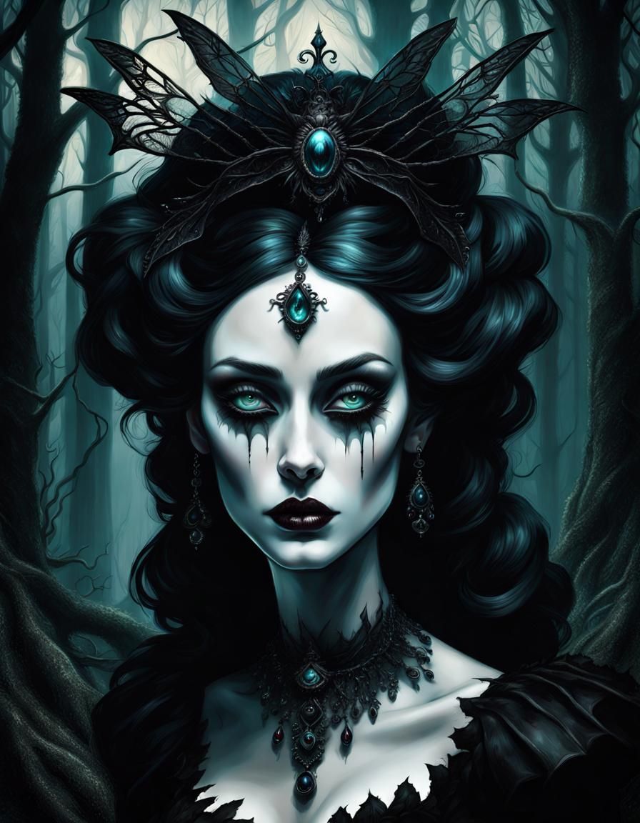 This image shows a gothic fairy in a noir head and shoulder portrait. The fairy has enchanting eyes, sophisticated jewelry, flawless features, and bloody mascara, set against a magical forest in dark academia style.