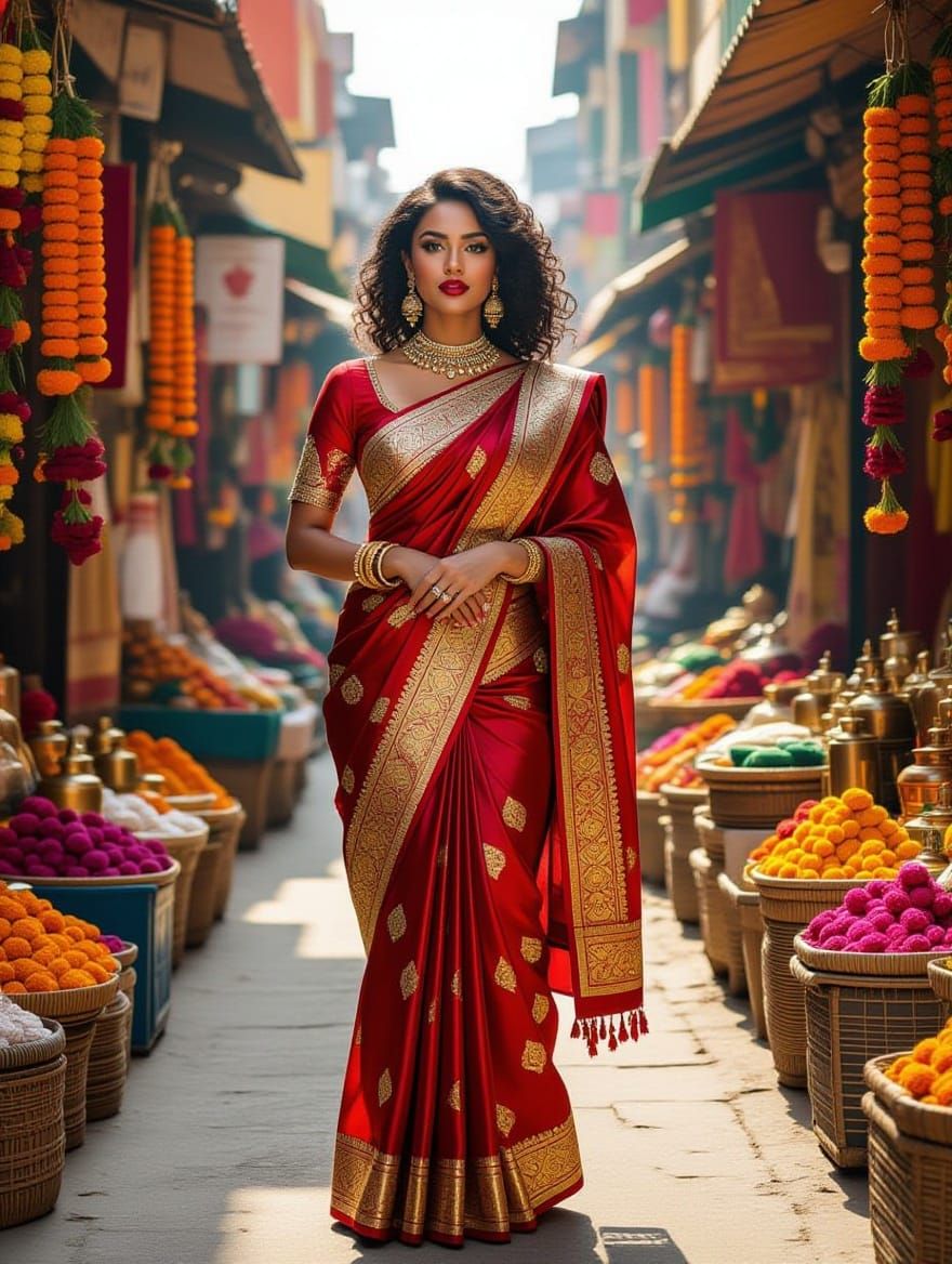A striking picture of a confident woman in sari-inspired dress in a vibrant Indian market. This image is a bold impasto-expressionist painting with warm light and expressive architecture.