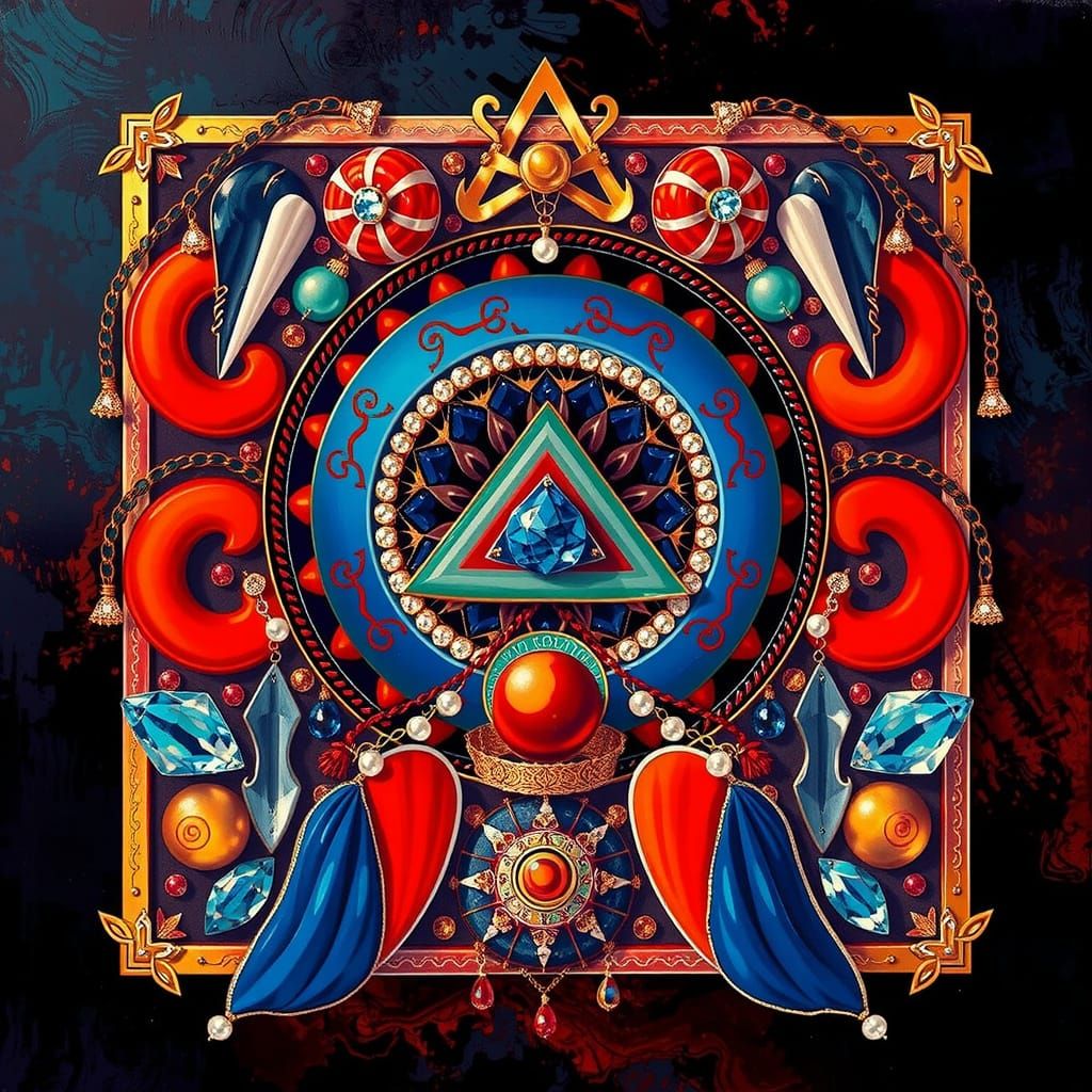 This hyperrealistic image showcases a detailed arrangement of pearls, seashells, and baubles in soft gelato colors with striking red and white stripes. Accented with gold and silver.