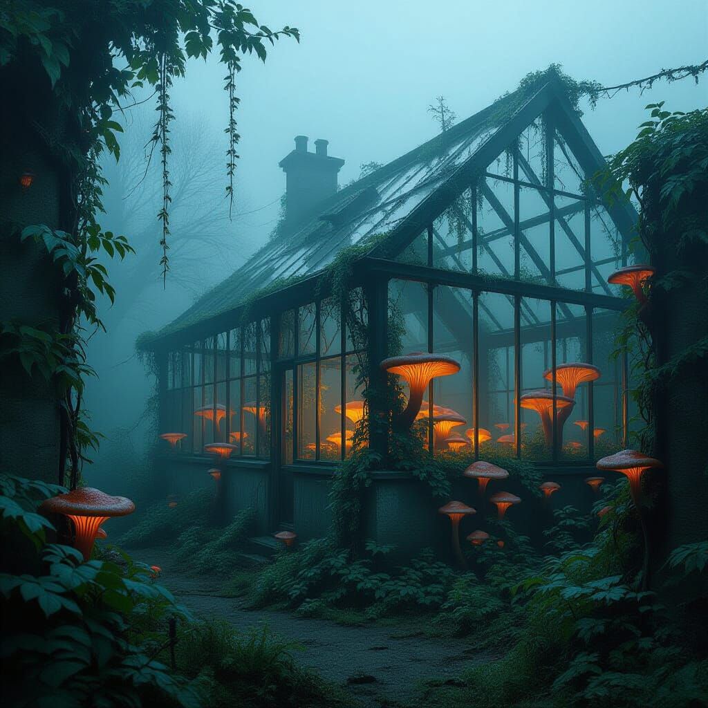 This image shows a mist-covered, derelict greenhouse consumed by bizarre vines and glowing mushrooms. The scene evokes a haunting, atmospheric aesthetic reminiscent of digital artwork.