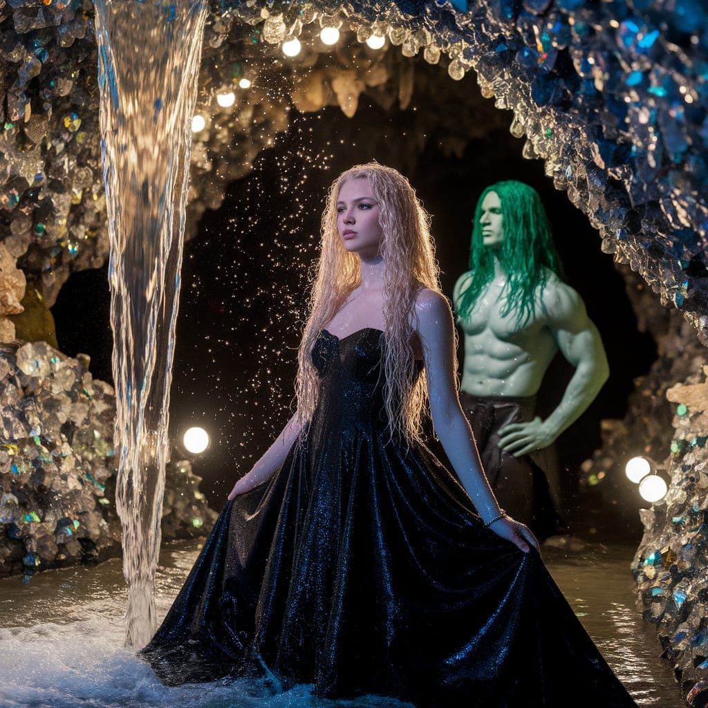 A breathtaking photograph of a blonde woman in flowing black garments standing before a dazzling waterfall inside a crystal-lined cavern. A muscular, green-skinned man admires her in the soft light.
