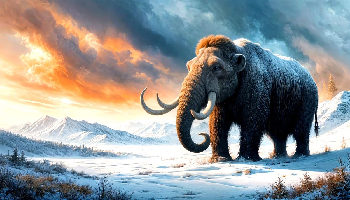 A striking picture of a woolly mammoth walking through a snowy valley as dawn breaks. This digital matte painting evokes a maximalist aesthetic with soft light and delicate details.