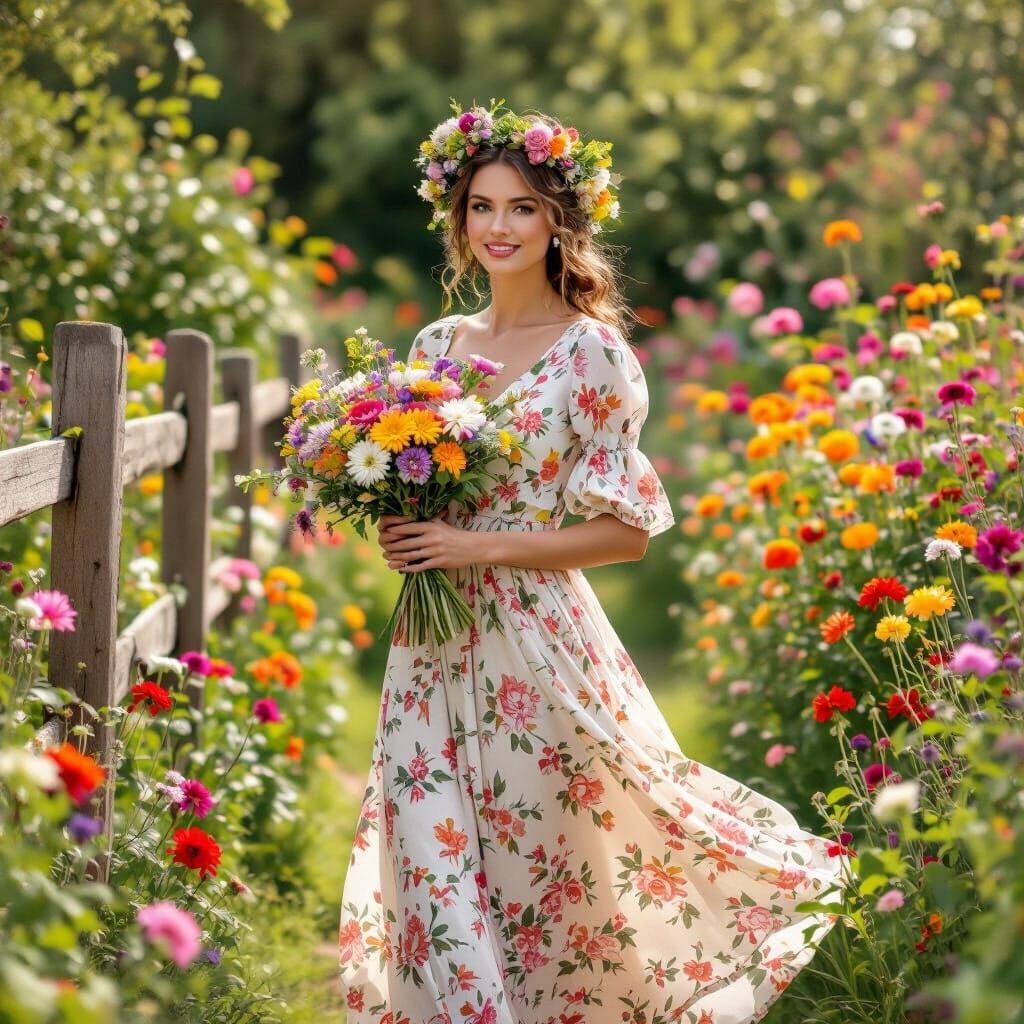 This image shows a woman in a sundress holding flowers, standing in a flower garden. The artwork evokes a whimsical, floral, impressionistic style.