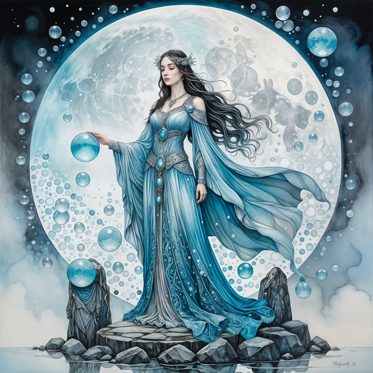 Generate your own magical alcohol ink illustrations of Morgan Le Fay and ancient stone circles. Free and easy AI art creation.