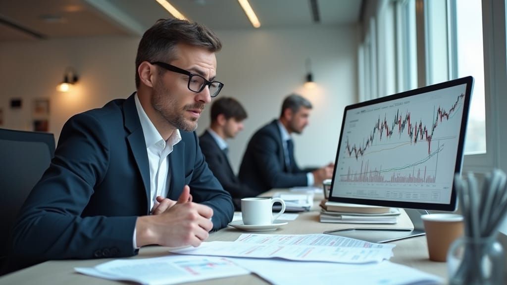 This image depicts a split scene of a meticulous investor and a nervous speculator, surrounded by financial charts and documents, showcasing a striking contrast between measured analysis and hasty decision-making, in a clean, modern style inspired by grid-based design and digital precision.