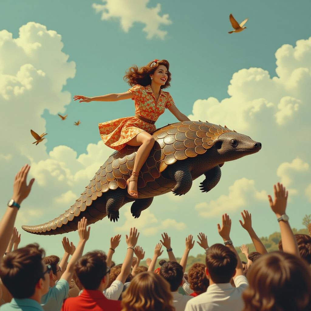 A vibrant, retro image of a woman soaring on a pangolin through a surreal crowd. The scene features cinematic staging, soft lighting, and deep shadows, reminiscent of 1960s staged chaos.