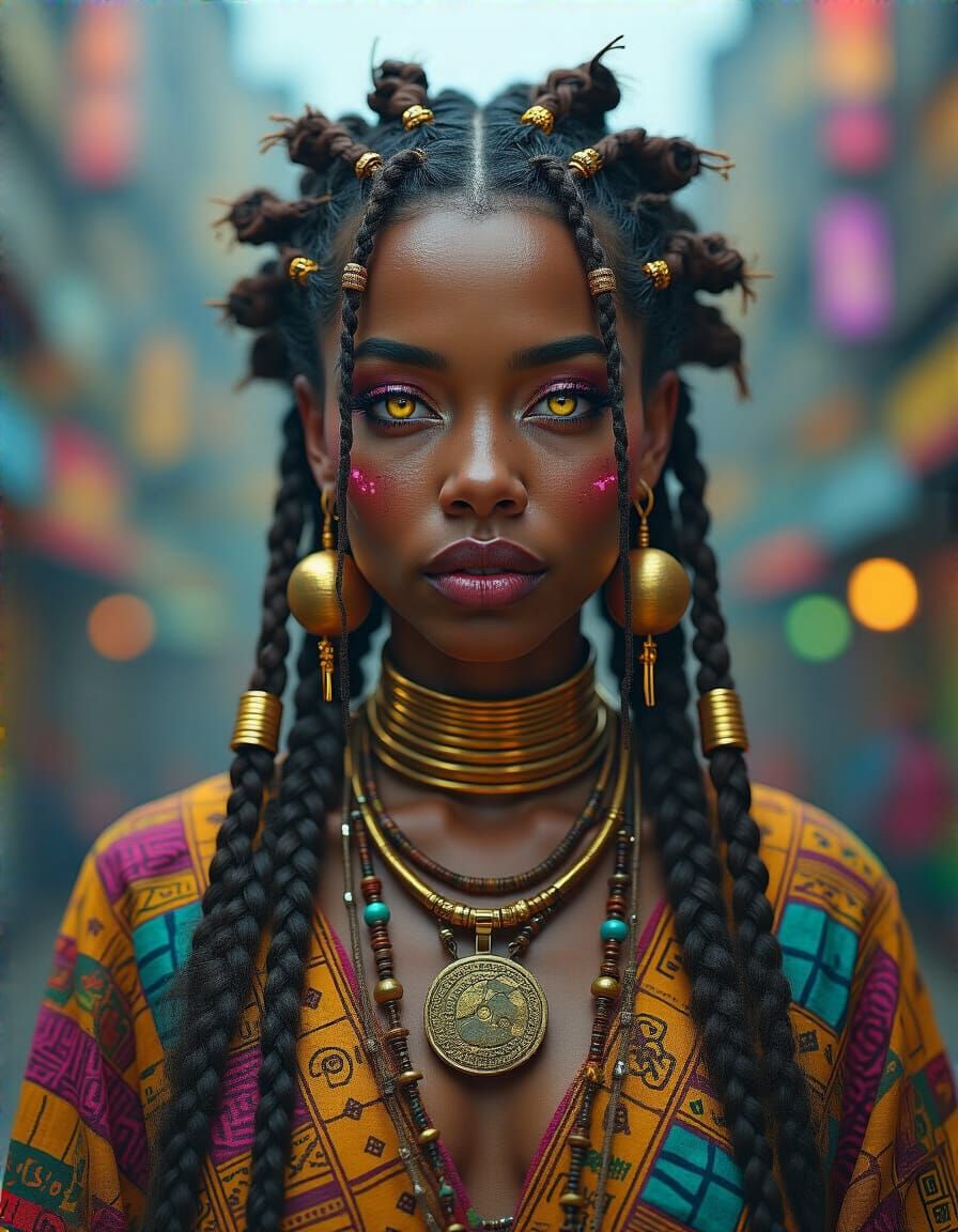 This image showcases a radiant Black woman with intricate braids adorned with gold. The portrait features bioluminescent city lights and cosmic dust, rendered in a painterly digital-oil style.