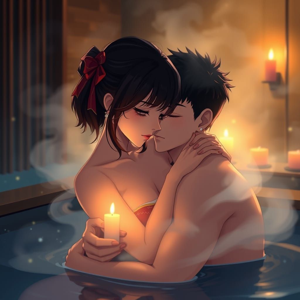 A serene and intimate image of a tenderly entwined anime couple, surrounded by warm candlelight and swirling mist in a peaceful onsen bathhouse, rendered in stunning 8k detail with vibrant colors and sensual details.
