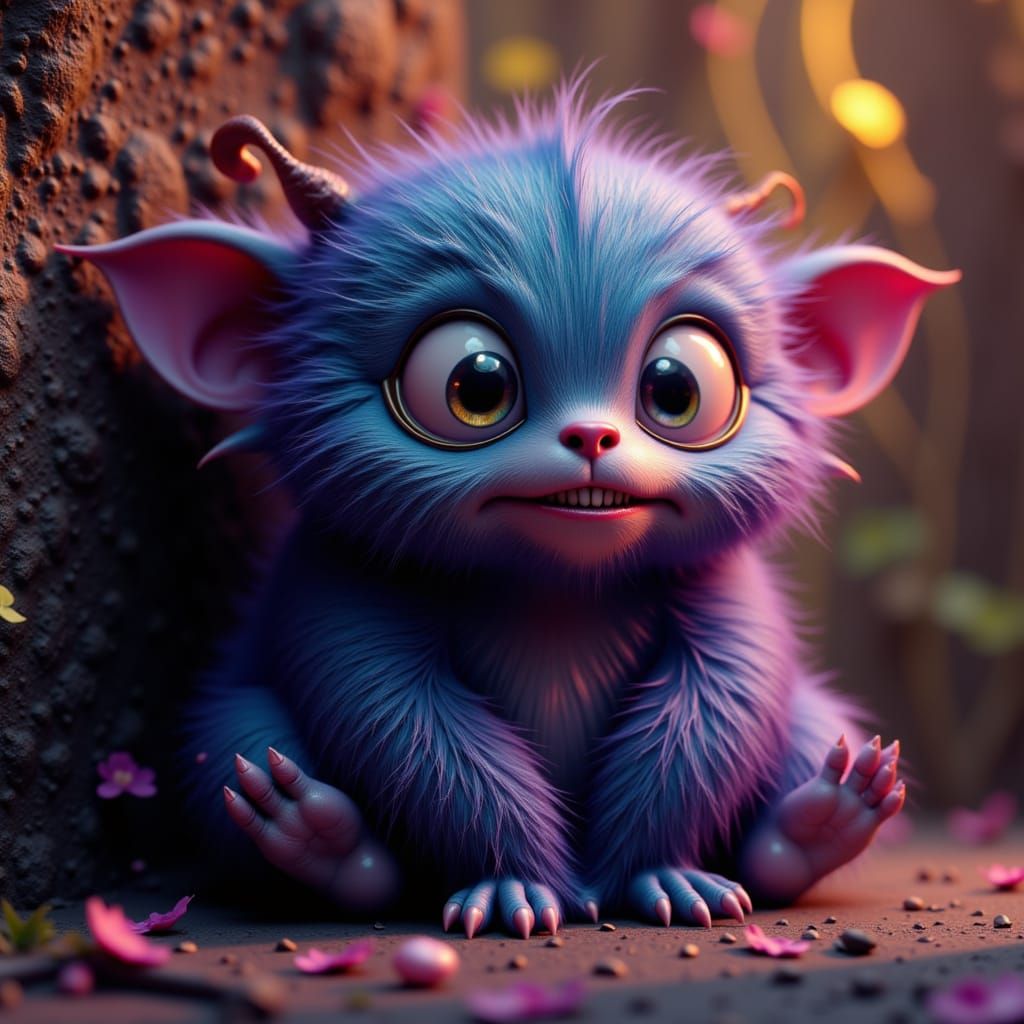 This image shows a sulky, hairy baby monster in time out. The cartoon CGI rendering features intricate details, deep color, and complementary colors, reminiscent of fantasy concept art.