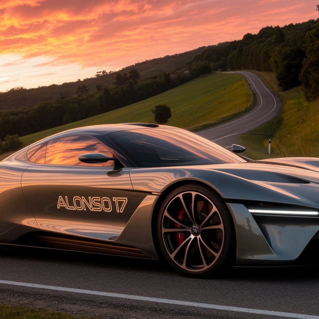 This image captures a modern Alonso 17 car in a picturesque country setting, with its aerodynamic design and bold lines standing out against a warm golden sunset backdrop.