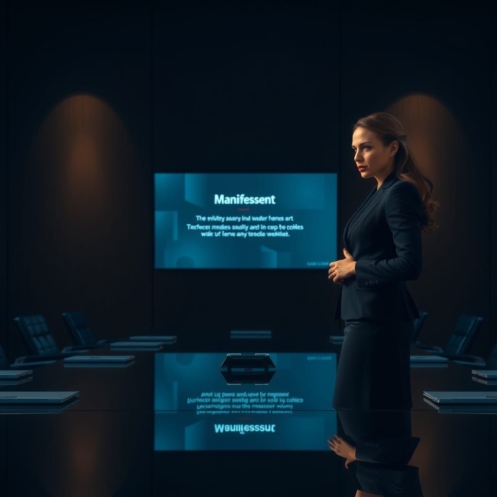 This image shows a woman in a sleek z-black tailored suit presenting a manifesto on a digital display in a dimly lit corporate boardroom, conveying a sense of power and control.