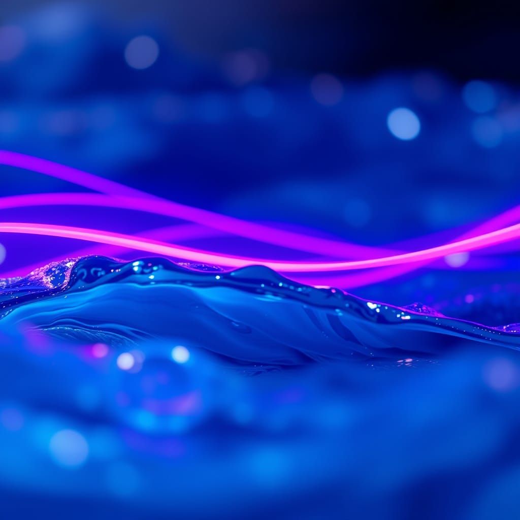 This abstract digital art blends vibrant purple LED light streaks with dynamic blue ocean waves. It features a shallow depth of field with soft bokeh, captured with professional photography techniques.