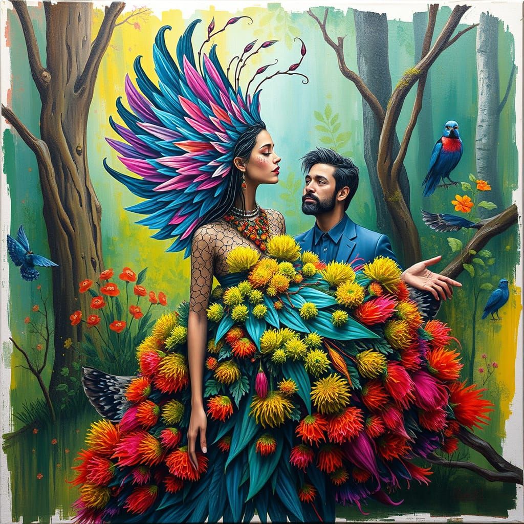 A vibrant painting of a woman in a living dress of feathers and moss greeting a man amidst lush nature. The artwork features bold colors and organic forms in an expressive, layered style.