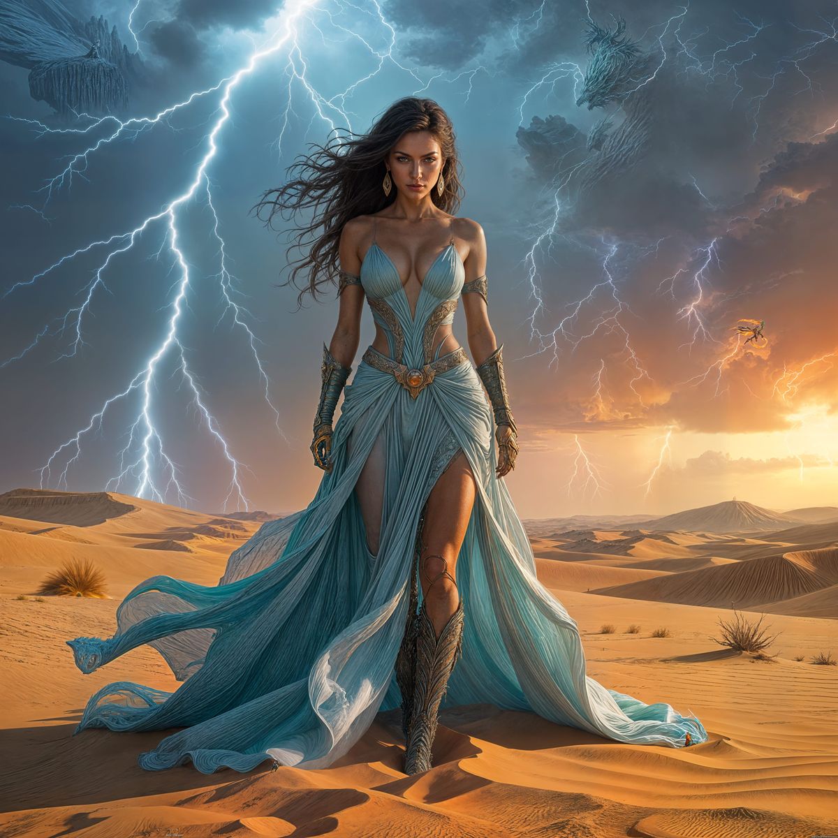 This image shows a fierce woman with a dress made of colorful molten glass. The scene is a stormy desert with lightning strikes, rendered in an epic fantasy illustration style with hyperrealistic detail and dramatic lighting.