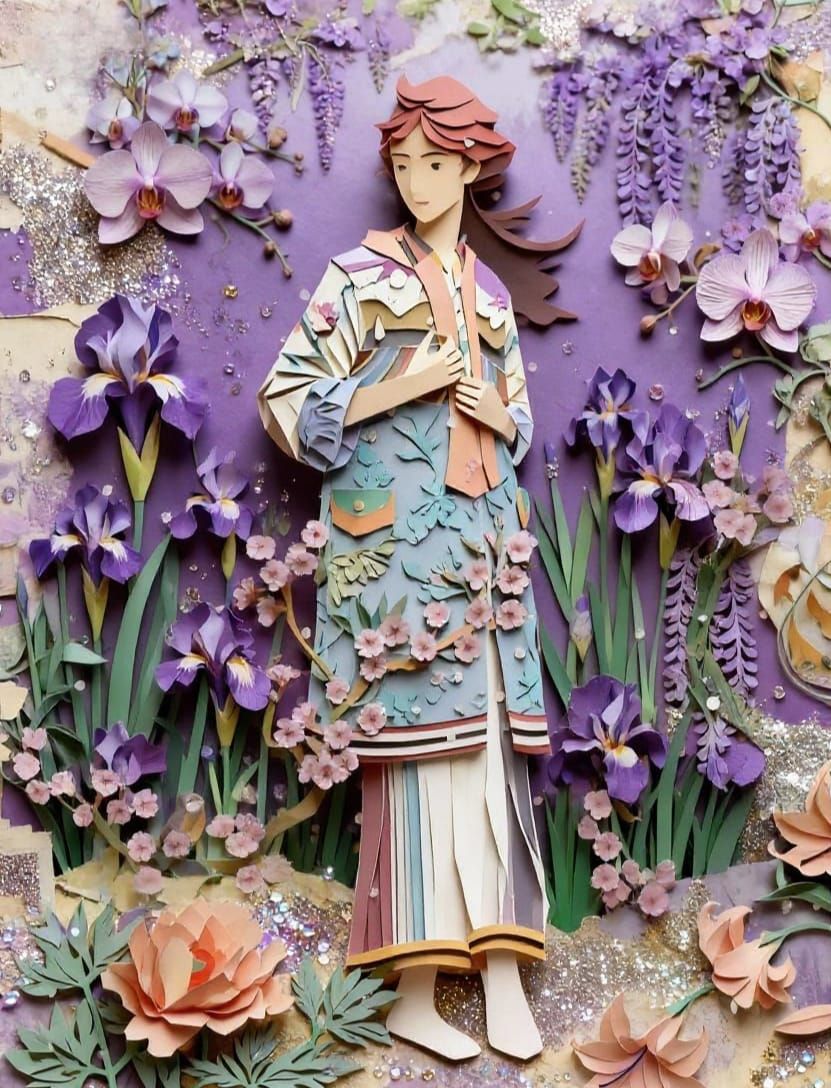 This image features a textured 3D kirigami woman in a floral robe within a collage background of a purple garden, enhanced with glitter and sequins. Inspired by mixed media art styles.