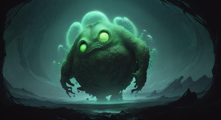 This cinematic film still captures a shapeless, amoeba-like creature with temporary eyes and mouths, set against a backdrop of swirling protoplasmic bubbles, evoking a sense of epic drama and atmospheric wonder.