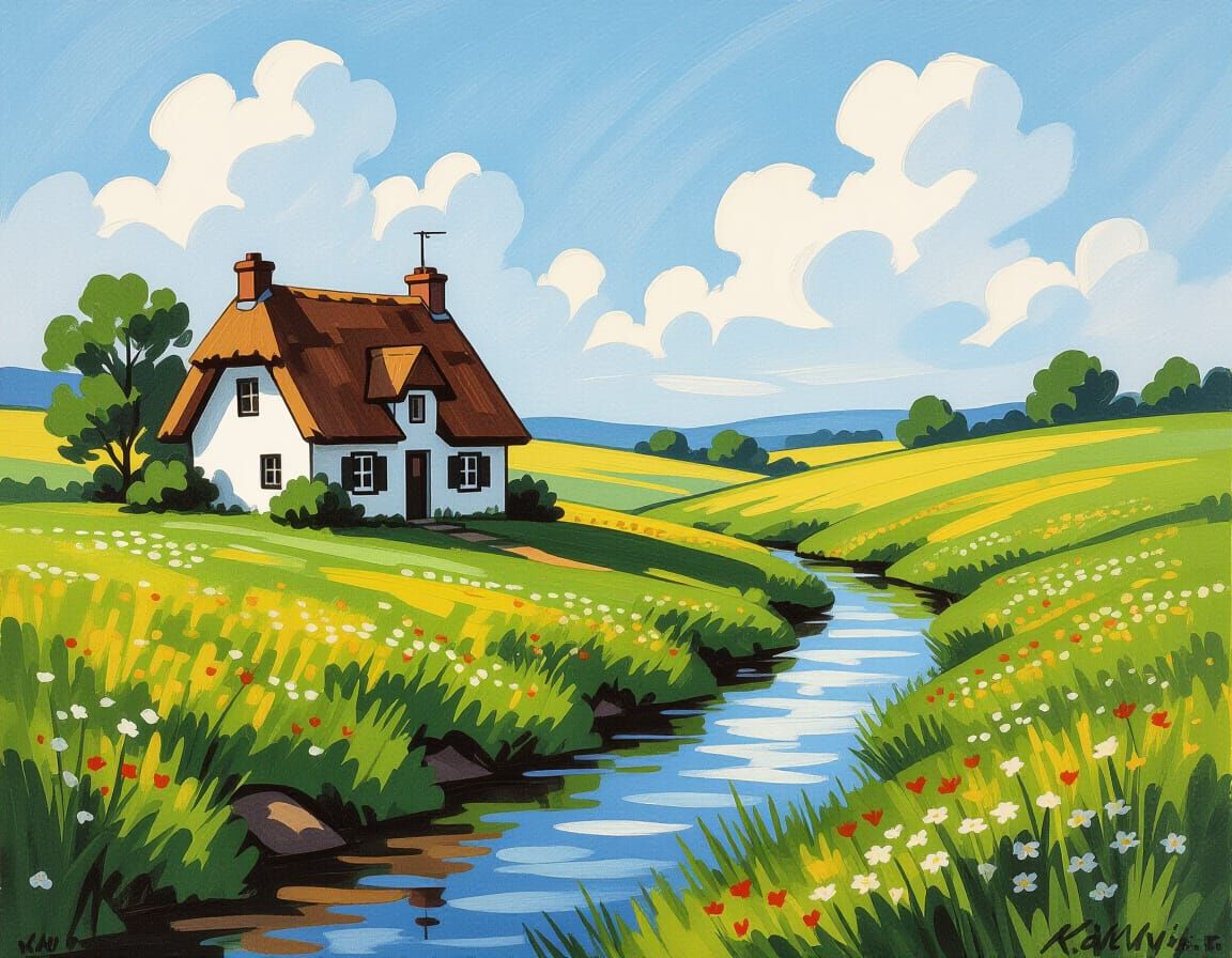 This hyperdetailed charcoal drawing depicts a sunlit cottage amidst rolling green hills and wildflowers, with a reflective stream. It features intricate textures and dramatic lighting, evoking a powerful artistic style.