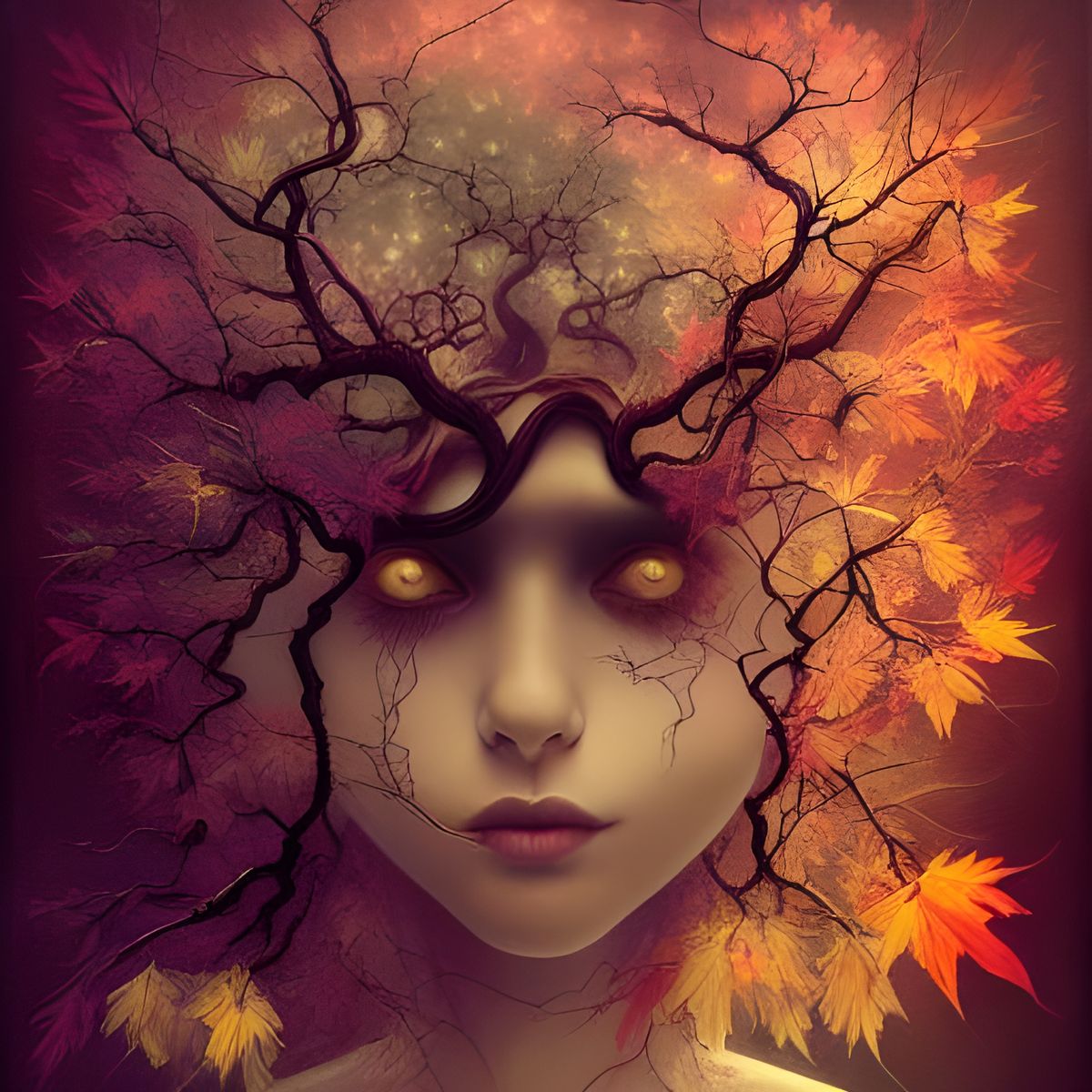 A surreal image of a decaying oak with colorful leaves, wildflowers, vines and cobwebs. The artwork features a symmetrical face and fractal elements in a surrealist style.