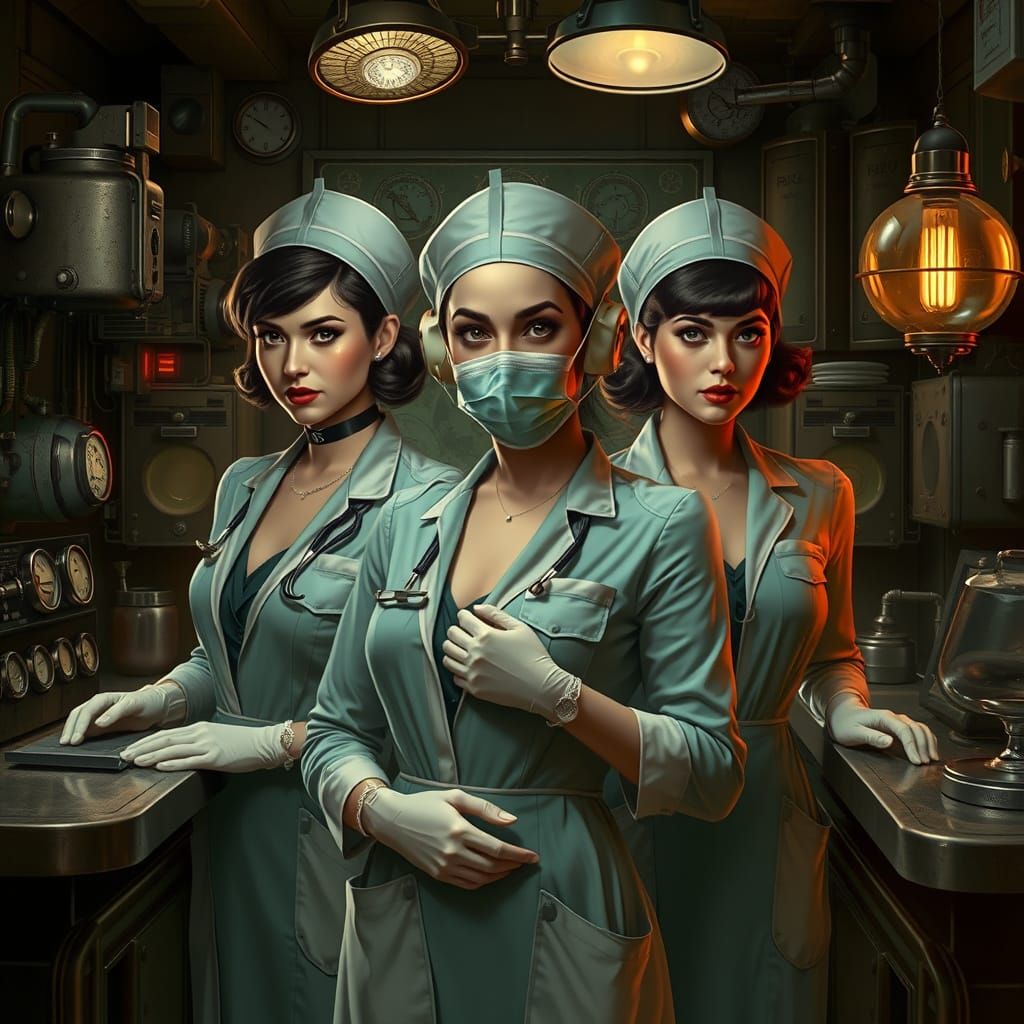 A digital artwork portraying female surgeons in a clandestine 1920s speakeasy setting, complete with period medical tools. The scene evokes art deco and film noir styles.
