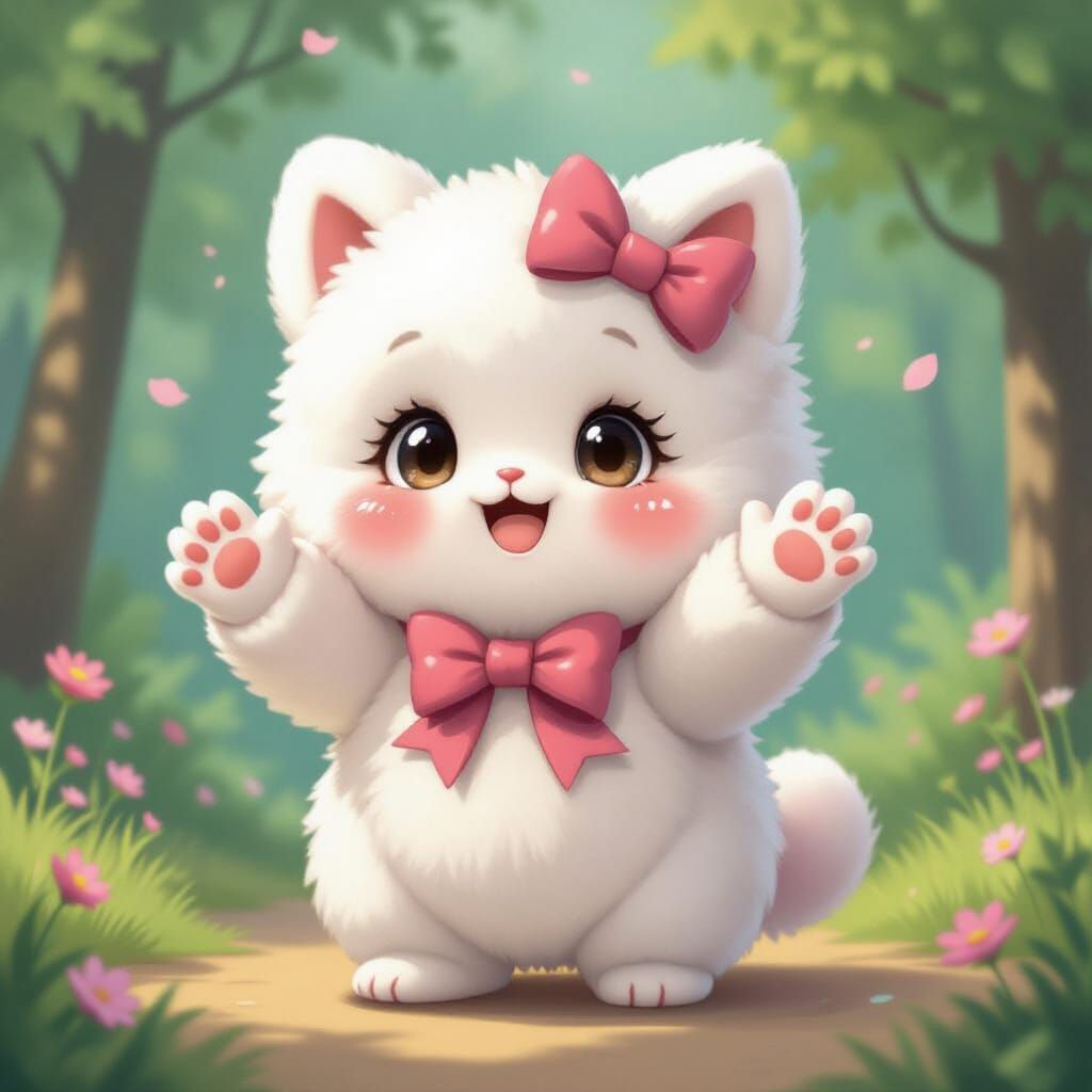 This image features a delightful, fluffy creature resembling a marshmallow with soft pastel fur. It's depicted waving its small hands enthusiastically, capturing a whimsical and charming aesthetic.