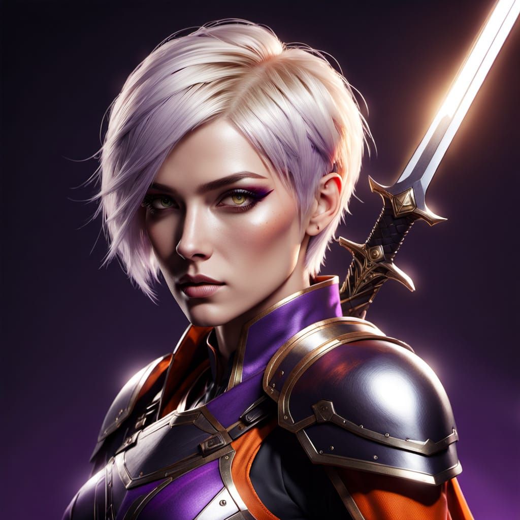 This image showcases a detailed illustration of an androgynous warrior with short, platinum-blonde hair, holding a trio of swords amidst a vibrant, moody atmosphere with warm golden tones and subtle lens flares.