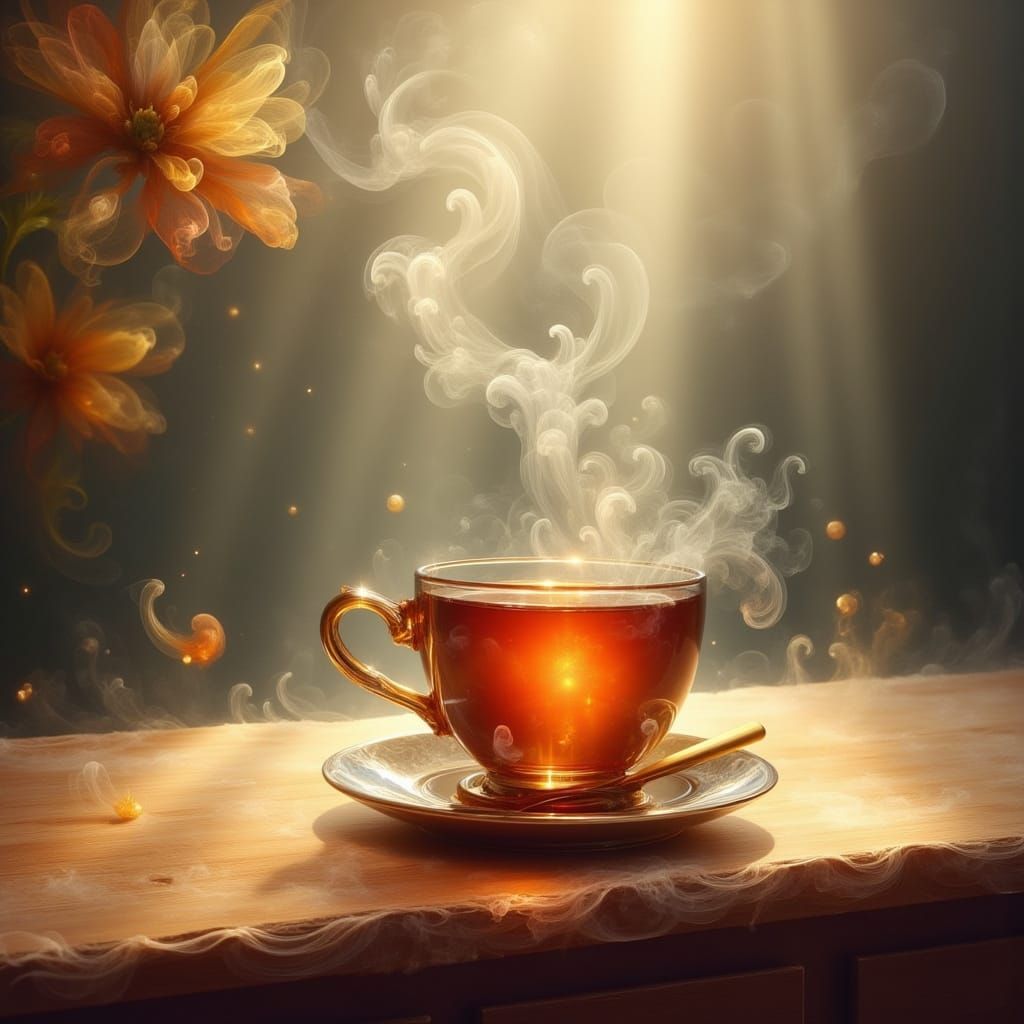 A painterly image of a steaming tea cup on a wooden table, bathed in a single ray of sunlight, creating a cozy morning atmosphere in an impressionistic style.