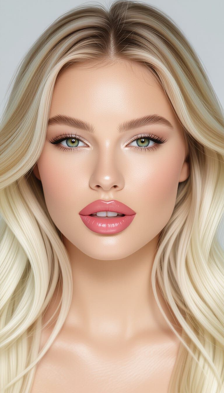 This realistic image showcases a beautiful blonde woman with her lips slightly parted, revealing the tip of her tongue. A striking close-up portrait.