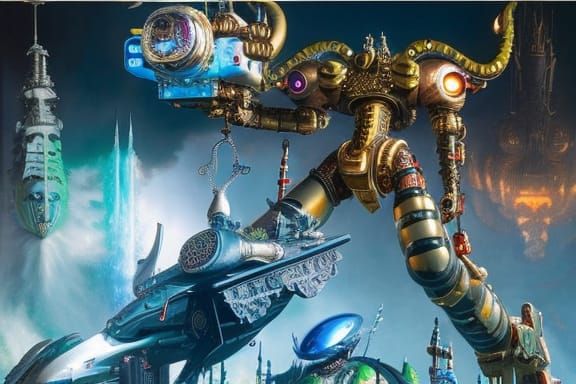 By Frank Kelly Freas! Panoramic shot of Robotic Hyper Mechanical Demonic robot fighting the crowd of the other world by Christophe Heughe, Post-Production SFX insanely detailed intricate hypermaximalist, elegant, ornate, hyper realistic, super detailed, decent pantone coloration, serene, 16k resolution, ...