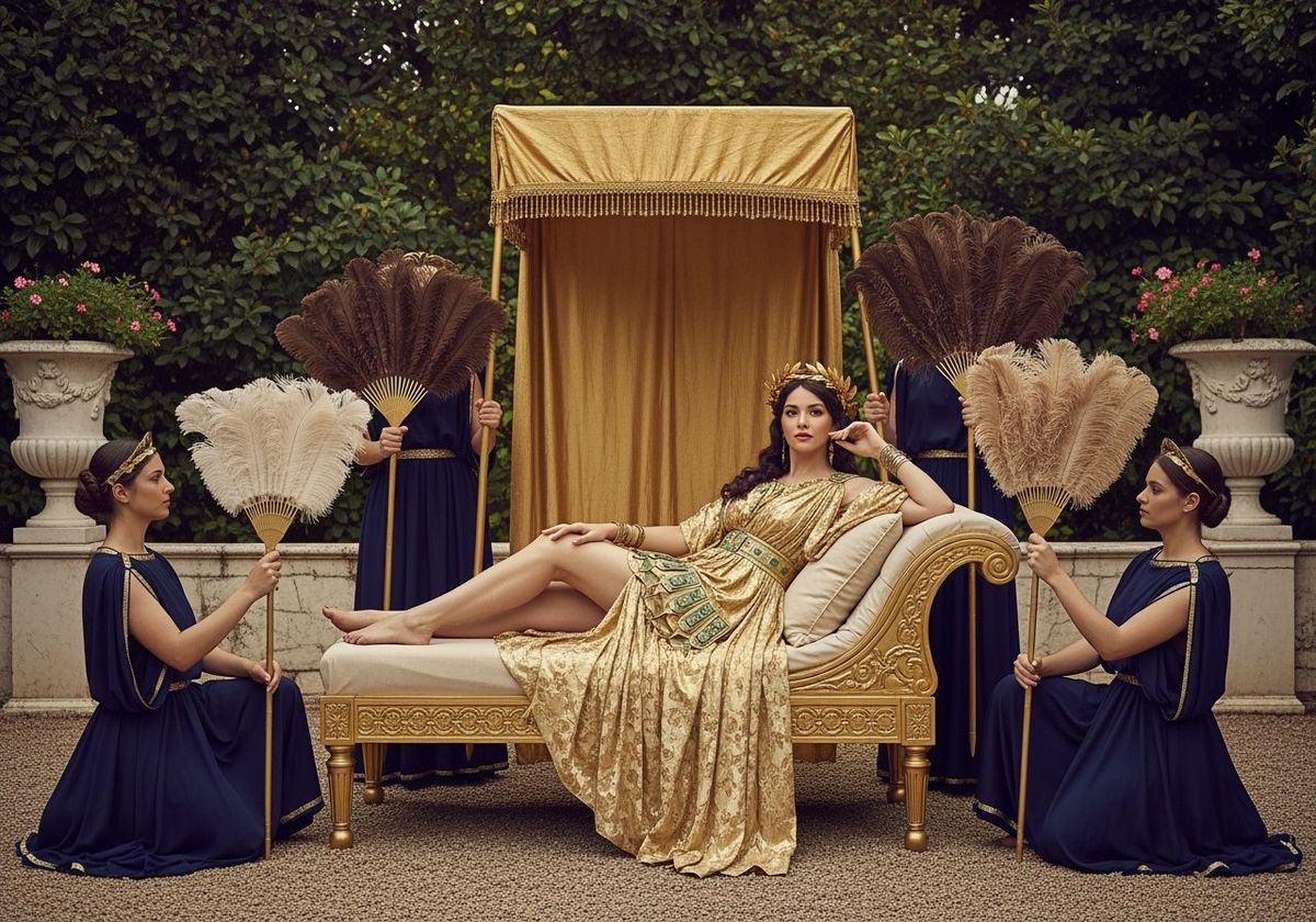 This image depicts Empress Messalina reclining on a golden divan in her palace gardens. Servants attend to her in this photograph, reminiscent of high-fashion DSLR photography with sharp focus and intricate details.